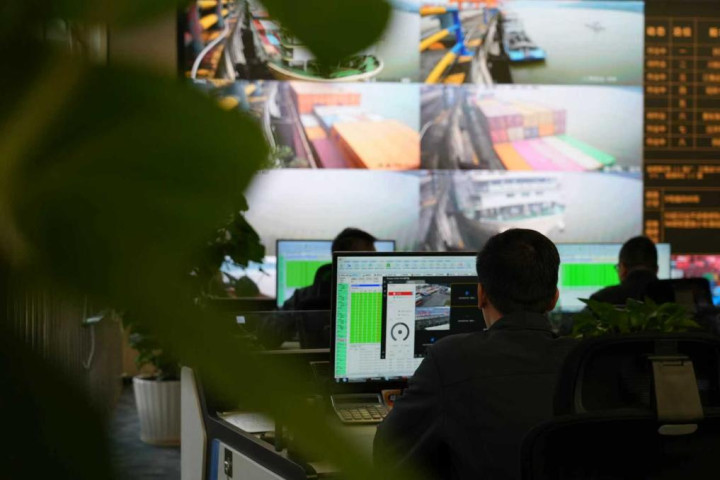 工作人员在重庆果园港远控室操作吊装集装箱。新华社记者 李爱斌 摄