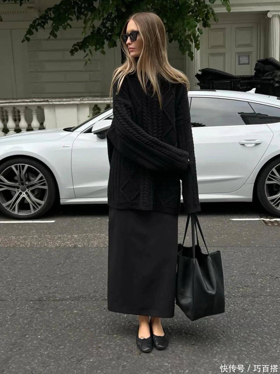 黑色毛衣除了可以和长裤搭配外。还可以和半裙搭配,今年爆火的醋酸裙与之搭配,简单又有女人味,不用刻意勾勒身材曲线就能利用裙摆在人的心中荡起层层涟漪,对30+、40+姐妹来说非常友好。